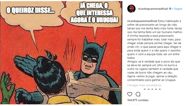 Ricardo Quaresma ise Instagram hesabından yaptığı paylaşımda "Hayatım boyunca ön yargıdan dolayı acı çektim, bu beni daha da güçlendirdi, beni daha iyi bir insan yaptı. Ön yargılara yanıtım her zaman hayalini kurduğum yere ulaşmak için daha sıkı çalışmak daha fazla mücadele etmek oldu. Nereden geldiğimi ve nereye gitmek istediğimi biliyorum. Gitmek istediğim yere yalnız değil takımımla gitmek istiyorum. Önümüzde Uruguay maçı var ve o maça odaklanıyoruz." sözlerini kullanmıştı. Quaresma'nın bu paylaşımda kullandığı görsel de dikkat çekmişti.