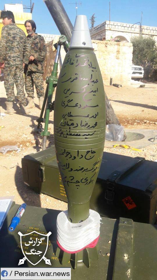 Alttaki fotoğrafta Suriye'de bulunan İran Devrim Muhafızlar Ordusunun Fatihin gücünün Halep'te kullandığı havan topunu görüyorsunuz. Havan topunda çatışmalarda ölen İranlı askerlerin isimleriyle beraber yazılan ilginç slogan ise şu: “Vilayet-i Fakih'e karşı olanlara ölüm!”
