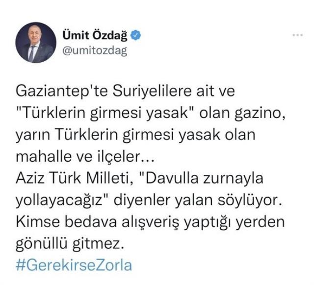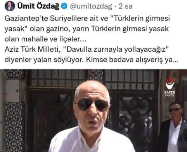 Mültecilerle ilgili yalanlarıyla gündeme gelen ve kamuoyunda ırkçı mülteci olarak bilinen Zafer Partisi lideri Ümit Özdağ, dün Gaziantep'te bir gazinonun önünden video paylaştı. Suriyelilere ait olduğu ve Türk vatandaşlarının giremediği öne sürülen gazinonun işletmecisinin Türk olduğu ortaya çıktı. Gazino hakkındaki iddiaları asılsız çıkan ve vatandaşların tükürdüğünü yalattığı Ümit Özdağ, sosyal medyadan yaptığı paylaşımı apar topar sildi.