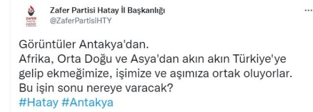 Zafer Partisi paylaşımında Hatay'da bir sokakta müzik yapan siyahi insanları paylaşarak "Görüntüler Antakya'dan. Afrika, Orta Doğu ve Asya'dan akın akın Türkiye'ye gelip ekmeğimize, işimize ve aşımıza ortak oluyorlar. Bu işin sonu nereye varacak?" notunu düştü.