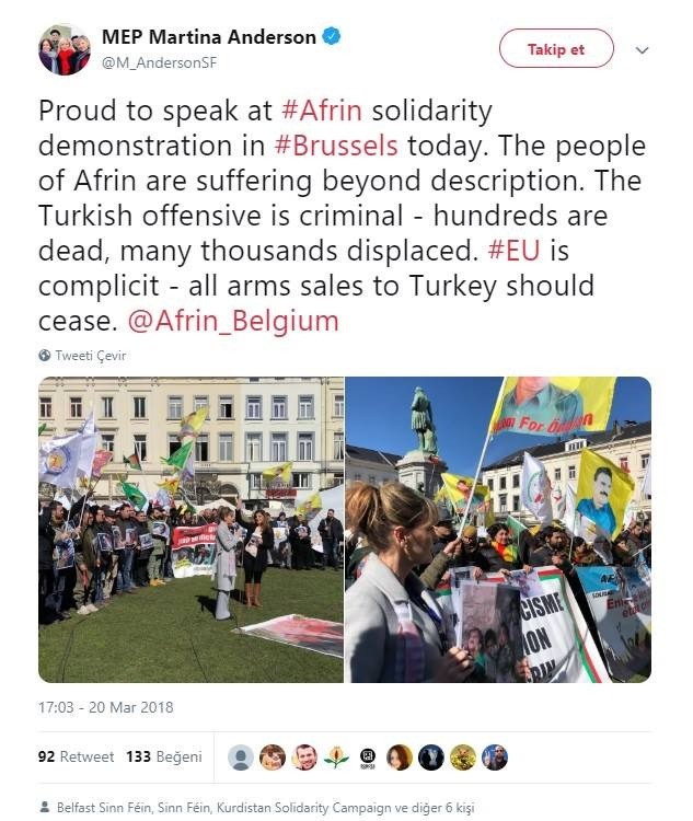 Martina Anderson’un bundan evvel de ikide bir terörist başı ve yandaşlarına destekte bulunduğu görülmüştü. Binlerle masumun katili Öcalan’a tecrit sona ersin diye açlık grevine giren Leyla Güven için Anderson 25 Ocak tarihli twitinde “ne kadın ama” notu düşüp kendisinden söz paylaşmıştı.