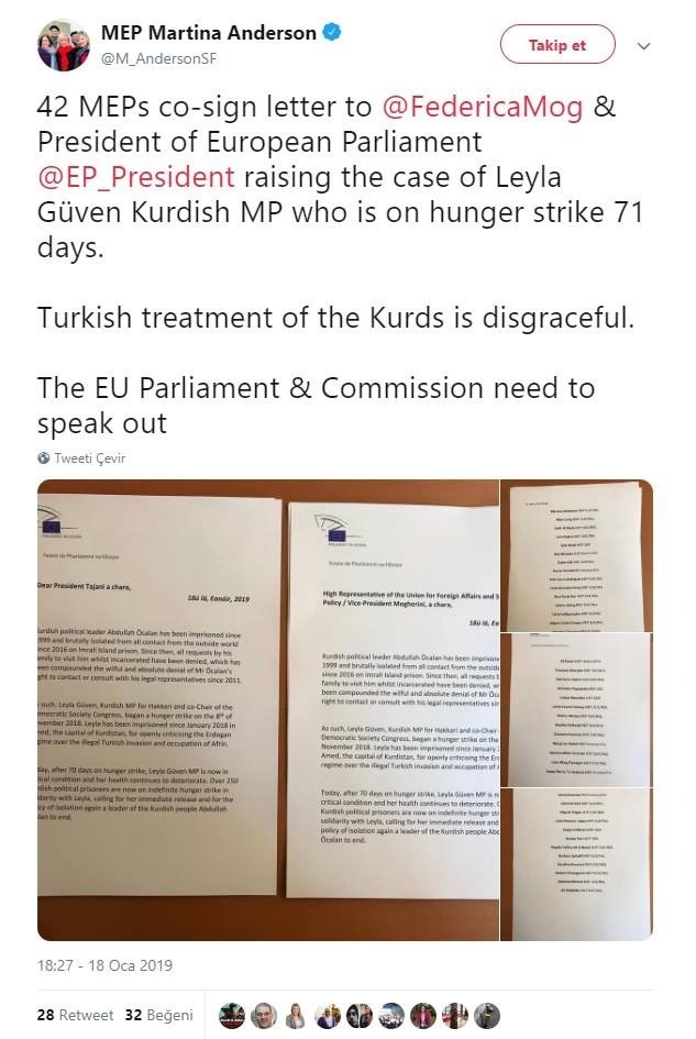 Bundan 10 gün evvel, yani 18 Ocaktaki paylaşımında ise AP üyesi toplam 42 kişi olarak Avrupa Komisyonu Başkan yardımcısı Federica Mogherini’ye Leyla Güven için mektup yazdıklarını duyurmuştu. Anderson bu twitinde, “Türklerin Kürtlere muamelesi utanç verici” demek hadsizlik, edepsizlik, nezaketsizlik, cahillik ve müfteriliğini de sergilemişti.