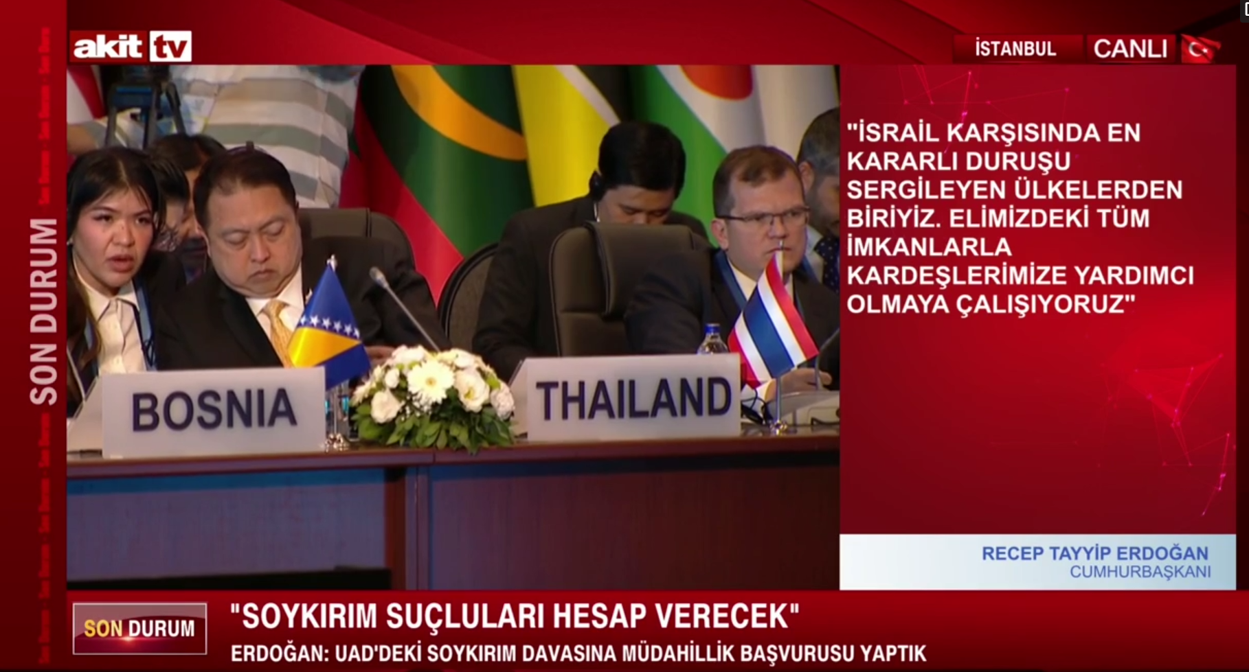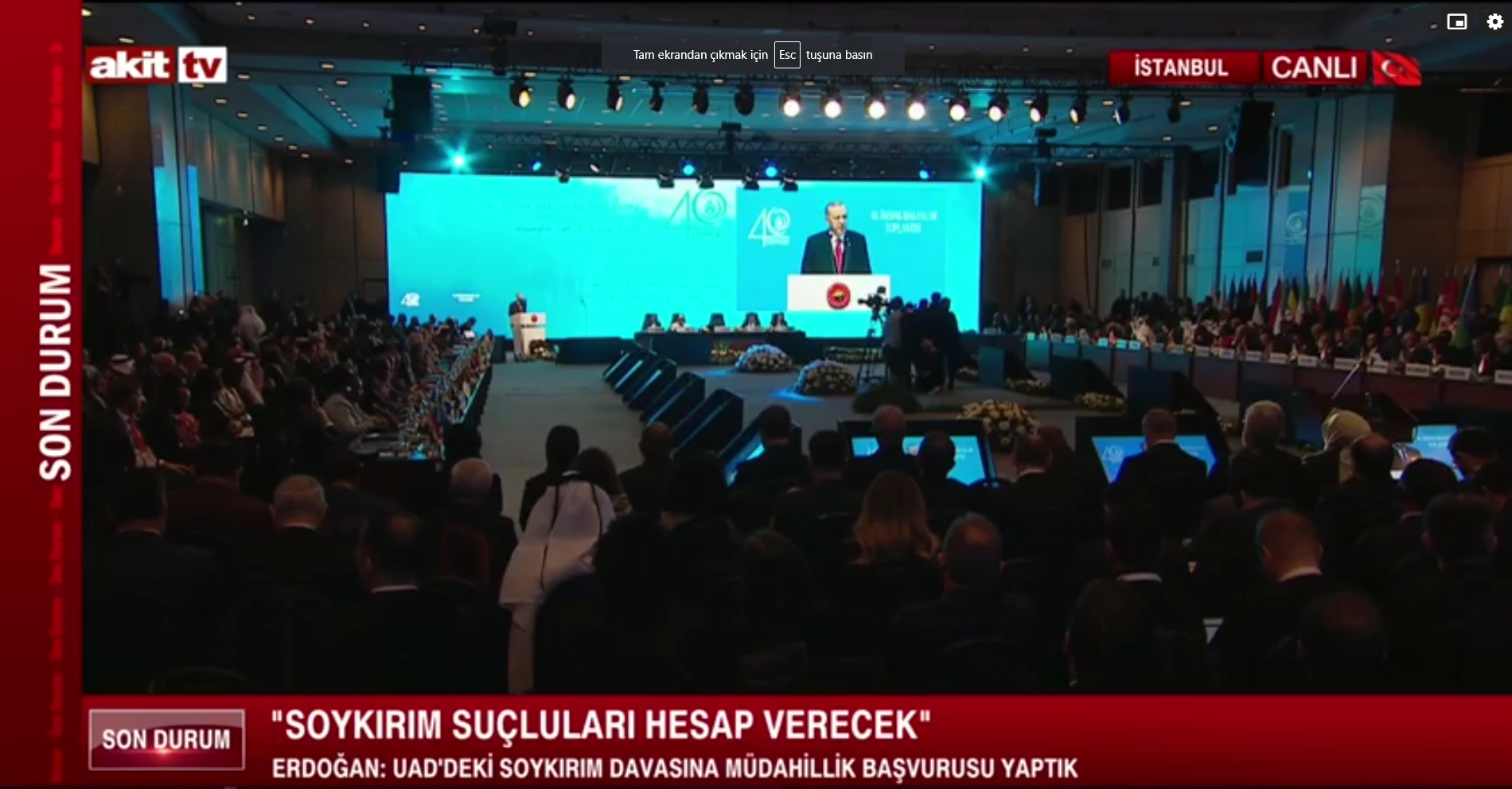 Cumhurbaşkanı Recep Tayyip Erdoğan, Lütfi Kırdar Uluslararası Kongre ve Sergi Sarayı'nda, 40. İSEDAK Toplantısı Açılış Programı'nda konuşuyor. Erdoğan: "Son asrın en vahşi soykırımlarından biri hemen yanı başımızda Gazze'de yaşandı ve yaşanıyor" dedi.
