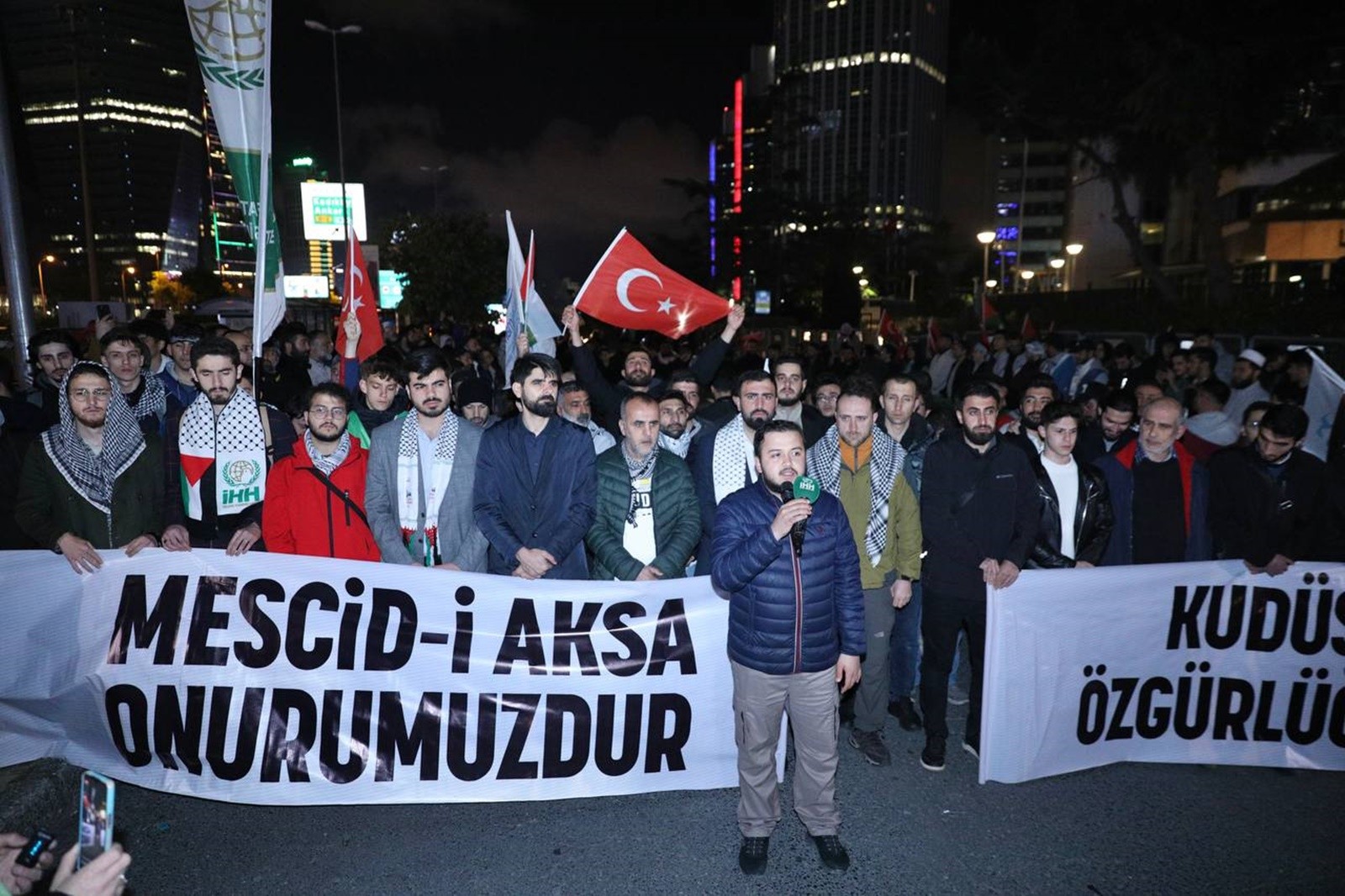 İsrail’in siyaseten sıkıştığı süreçlerde namlusunu Filistinlilere daha çok döndürdüğü belirtilen açıklama şu cümlelerle sona erdi: “Bu hafta Nekbe’nin yıldönümü. Görüyoruz ki, Nekbe geçmişte kalmadı. Filistinliler Nekbeyi ve Nekbe’nin şartlarını her gün yaşamaya devam ediyor. Her gün evlerinden uzaklaştırılmak isteniyor. Her gün mabedlere saldırı oluyor. Nekbe’ye karşı çıkmalıyız. İsrail’in zulümlerine dur demeliyiz. Nekbe devam ettiği gibi Mavi Marmara ruhu da devam ediyor. Bu ruhla yetişen gençlik bugün meydanları dolduruyor. Buradan kanaat önderlerine, sivil toplum kuruluşlarına, vicdan sahiplerine çağrıda bulunuyoruz. Bir araya gelin ve İsrail’in planlarını hep beraber bozalım! Haydi seferber olalım. Teyakkuzda olalım. Meydanlara inelim. Hep beraber İsrail’e ders verelim.”