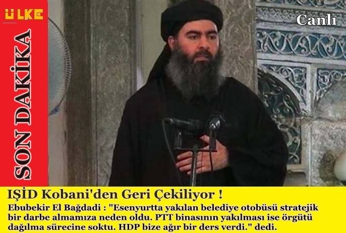 IŞİD lideri Ebubekir Bağdadi'nin fotoğrafının yer aldığı ve günün en çok paylaşılan görselleri arasında yer alan karede "SON DAKİKA: IŞİD Kobani'den Geri Çekiliyor! Ebubekir El Bağdadi, 'Esenyurt'ta yakılan belediye otobüsü stratejik bir darbe almamıza neden oldu. PTT binasının yakılması ise örgütü dağılma sürecine soktu. HDP bize ağır bir ders verdi.' dedi" ifadeleri yer aldı.