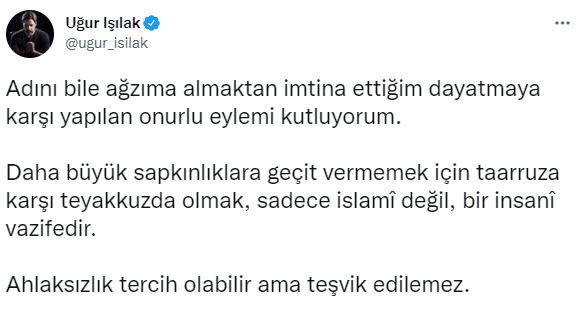 Işılak paylaşımında, “Adını bile ağzıma almaktan imtina ettiğim dayatmaya karşı yapılan onurlu eylemi kutluyorum. Daha büyük sapkınlıklara geçit vermemek için taarruza karşı teyakkuzda olmak, sadece islamî değil, bir insanî vazifedir. Ahlaksızlık tercih olabilir ama teşvik edilemez” dedi.