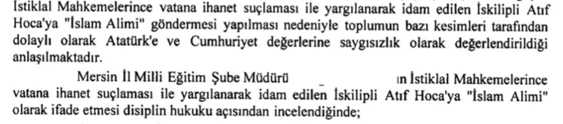 “Mersin İl Milli Eğitim Şube Müdürü E. Yıldız’ın şahsi twitter hesabından yaptığı paylaşım incelendiğinde; Gazi Mustafa Kemal Atatürk’ün kendisine veya şahsiyetine doğrudan bir hakaret veya eleştiri yapılmadığı, ancak paylaşımın içerisinde geçen İstiklal Mahkemelerince vatana ihanet suçlamasıyla idam edilen İskilipli Atıf Hoca’ya “İslam Alimi” göndermesi yapılması nedeniyle toplumun bazı kesimleri tarafından dolaylı olarak Atatürk’e ve Cumhuriyet değerlerine saygısızlık olarak değerlendirildiği anlaşılmaktadır.