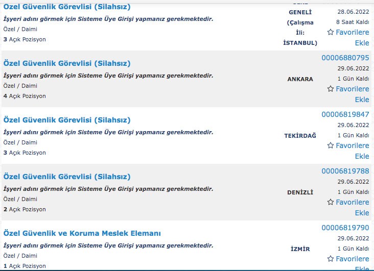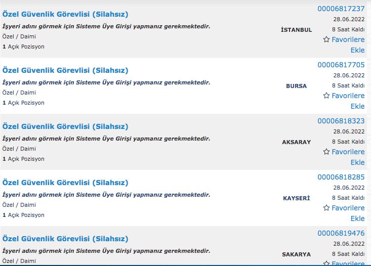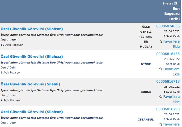 İŞKUR iş ilanları iş arayan binlerce vandaş tarafından sorgulanıyor. İŞKUR üzerinden muhasebeden, güvenlik görevlisine, büro elemanından üretim elemanına kadar çok sayıda personel alımı yapılıyor. İş arayanlar İŞKUR iş ilanlarını duyar duymaz detayları araştırmaya başladı. Bilhassa İŞKUR güvenlik görevlisi iş ilanları daha çok araştırılmakta. İŞKUR açık iş ilanları sorgulaması yapıldığında 2059 güvelik görevlisi alımı ilanı yapıldığı görülmekte. Peki İŞKUR iş ilanı şartları neler? İŞKUR güvenlik görevlisi alımı lise mezunu arasından alınıyor mu?