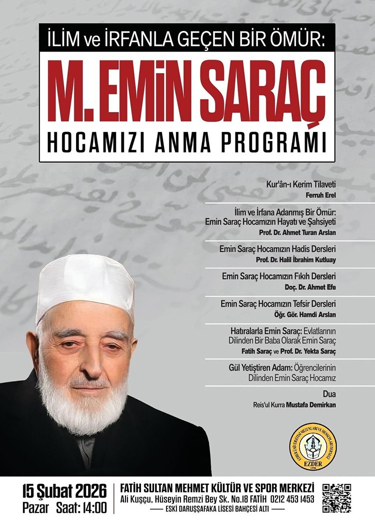 "İlim ve İrfanla Geçen Bir Ömür: M. Emin Saraç Hocamızı Anma Programı" 15 Şubat'ta Fatih Sultan Mehmet Kültür ve Spor Merkezi'nde gerçekleşecek.
