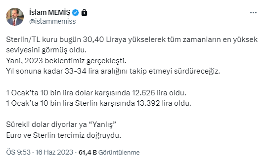 Bununla ilgili sosyal medya hesabından bir paylaşım yapan İslam Memiş, "Sterlin/TL kuru bugün 30,40 Liraya yükselerek tüm zamanların en yüksek seviyesini görmüş oldu. Yani, 2023 beklentimiz gerçekleşti. Yıl sonuna kadar 33-34 lira aralığını takip etmeyi sürdüreceğiz. 1 Ocak’ta 10 bin lira dolar karşısında 12.626 lira oldu. 1 Ocak’ta 10 bin lira Sterlin karşısında 13.392 lira oldu. Sürekli dolar diyorlar ya “Yanlış” Euro ve Sterlin tercimiz doğruydu" dedi.