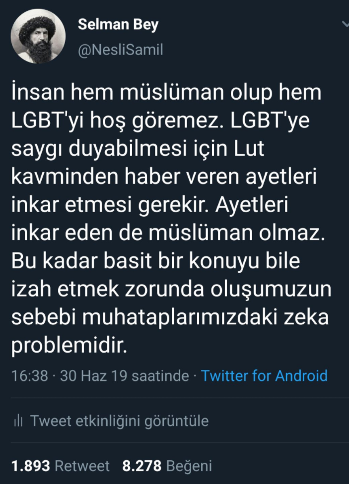 Twitter'da "Selman Bey" ismiyle paylaşım yapan bir vatandaş, Müslümanların LGBT'ye olan bakış açısıyla ilgili dikkat çeken bir mesaj yayınladı. Mesajında, "İnsan hem Müslüman olup hem LGBT'yi hoş göremez. LGBT'ye saygı duyabilmesi için Lut kavminden haber beren ayetleri inkar etmesi gerekir. Ayetleri inkar eden de Müslüman olmaz. Bu kadar basit bi konuyu bile izat etmek zorunda oluşumuzun sebebi muhataplarımızdaki zeka problemidir." ifadelerine yer verdi.