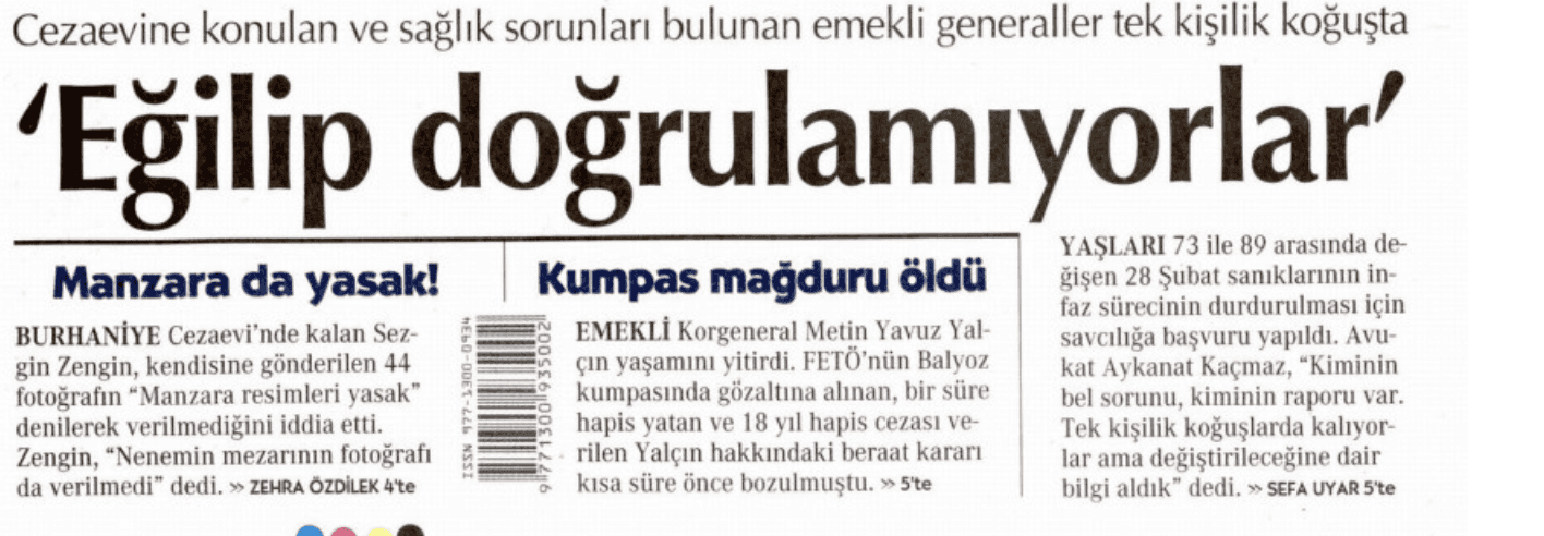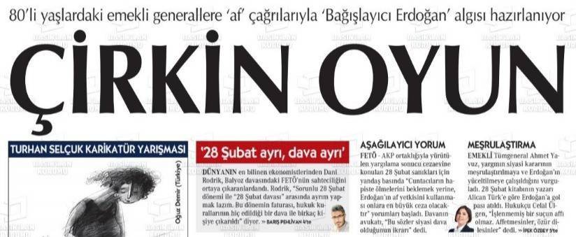 Darbeciler için, bir gün, "Eğilip doğrulamıyorlar" diye manşet atıp, 80 yaşındaki rütbeleri sökülmüş generallerin mağdur olduğunu iddia eden, diğer gün de "Erdoğan af yetkisini kullanarak kendisini yücelttirecek." diyerek her yolu deneyen Cumhuriyet, 28 Şubat mimarlarının içeriden çıkamama korkusuyla Yeni Akit gazetesinin manşet haberini hedef aldı.