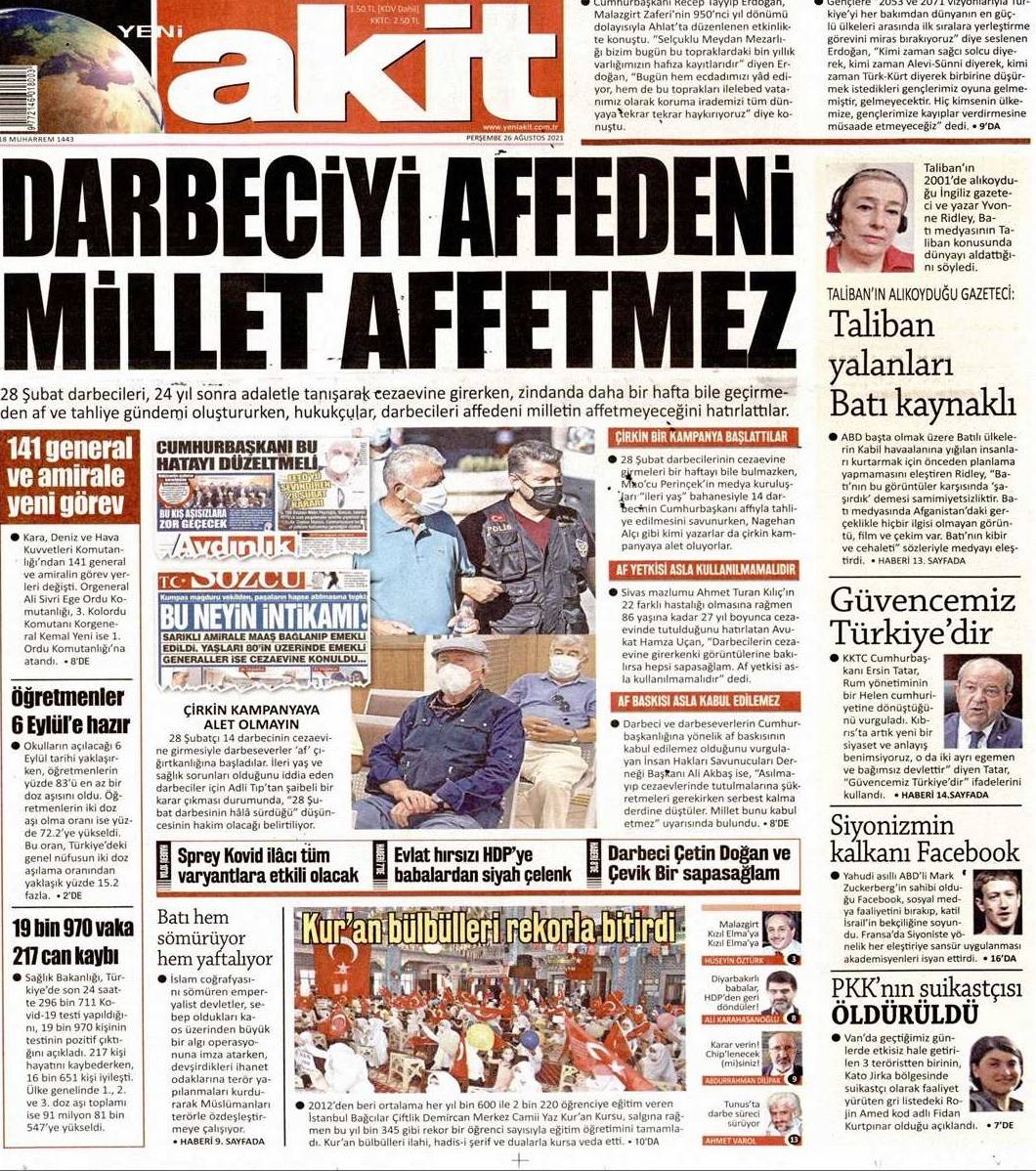 Cuntacılara yönelik af propagandasına dikkat çeken Yeni Akit, manşet haberinin başlığında "Darbeciyi affedeni millet affetmez" ifadelerini kullanmıştı. Haberde, 24 yıl sonra gelen adalete karşın, darbe destekçilerinin daha bir hafta geçmeden oluşturdukları "af ve tahliye" gündemine dikkat çekilmiş ve 22 farklı hastalığı bulunan Sivas mazlumu Ahmet Turan Kılıç hatırlatılmıştı. Avukat Hamza Uçan ile İnsan Hakları Savunucuları Derneği (İHSD) Genel Başkanı Ali Akbaş'tan alınan görüşlerin ortak mesajı şöyle olmuştu: “Darbeciler ve darbeseverlerin Cumhurbaşkanlığı’na yönelik af baskısı kabul edilemez.”