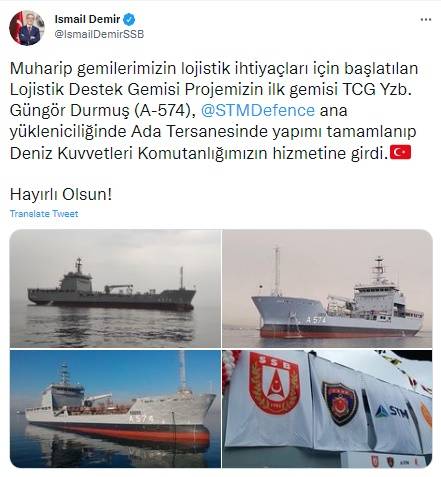 Sosyal medya hesabından açıklama yapan Demir, "Muharip gemilerimizin lojistik ihtiyaçları için başlatılan Lojistik Destek Gemisi Projemizin ilk gemisi TCG Yzb. Durmuş Güngör (A-574), STM Savunma ana yükleniciliğinde Ada Tersanesinde yapımı tamamlanıp Deniz Kuvvetleri Komutanlığımızın hizmetine girdi. Hayırlı Olsun!" ifadelerini kullandı.