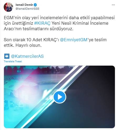 İsmail Demir, "EGM'nin olay yeri incelemelerini daha etkili yapabilmesi için ürettiğimiz KIRAÇ Yeni Nesil Kriminal İnceleme Aracı'nın teslimatlarını sürdürüyoruz. Son olarak 10 adet KIRAÇ'ı EGM'ye teslim ettik. Hayırlı olsun" ifadelerini kullandı.