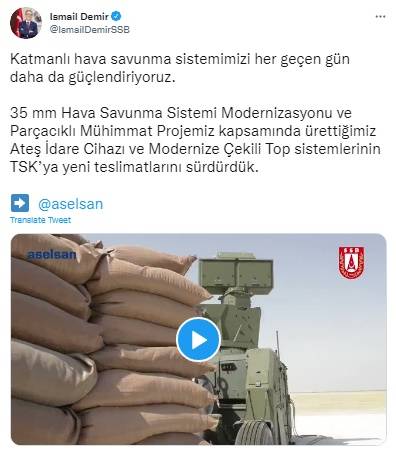 Demir, söz konusu paylaşımında, "Katmanlı hava savunma sistemimizi her geçen gün daha da güçlendiriyoruz. 35 mm Hava Savunma Sistemi Modernizasyonu ve Parçacıklı Mühimmat Projemiz kapsamında ürettiğimiz Ateş İdare Cihazı ve Modernize Çekili Top sistemlerinin TSK'ya yeni teslimatlarını sürdürdük" ifadelerini kullandı.
