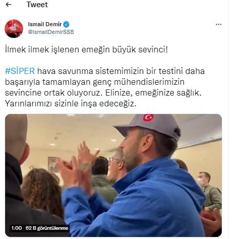 Savunma Sanayii Başkanı İsmail Demir sosyal medya hesabından yaptığı videolu paylaşımda SİPER hava savunma sisteminin bir testinin daha başarıyla geçtiğini duyurdu.