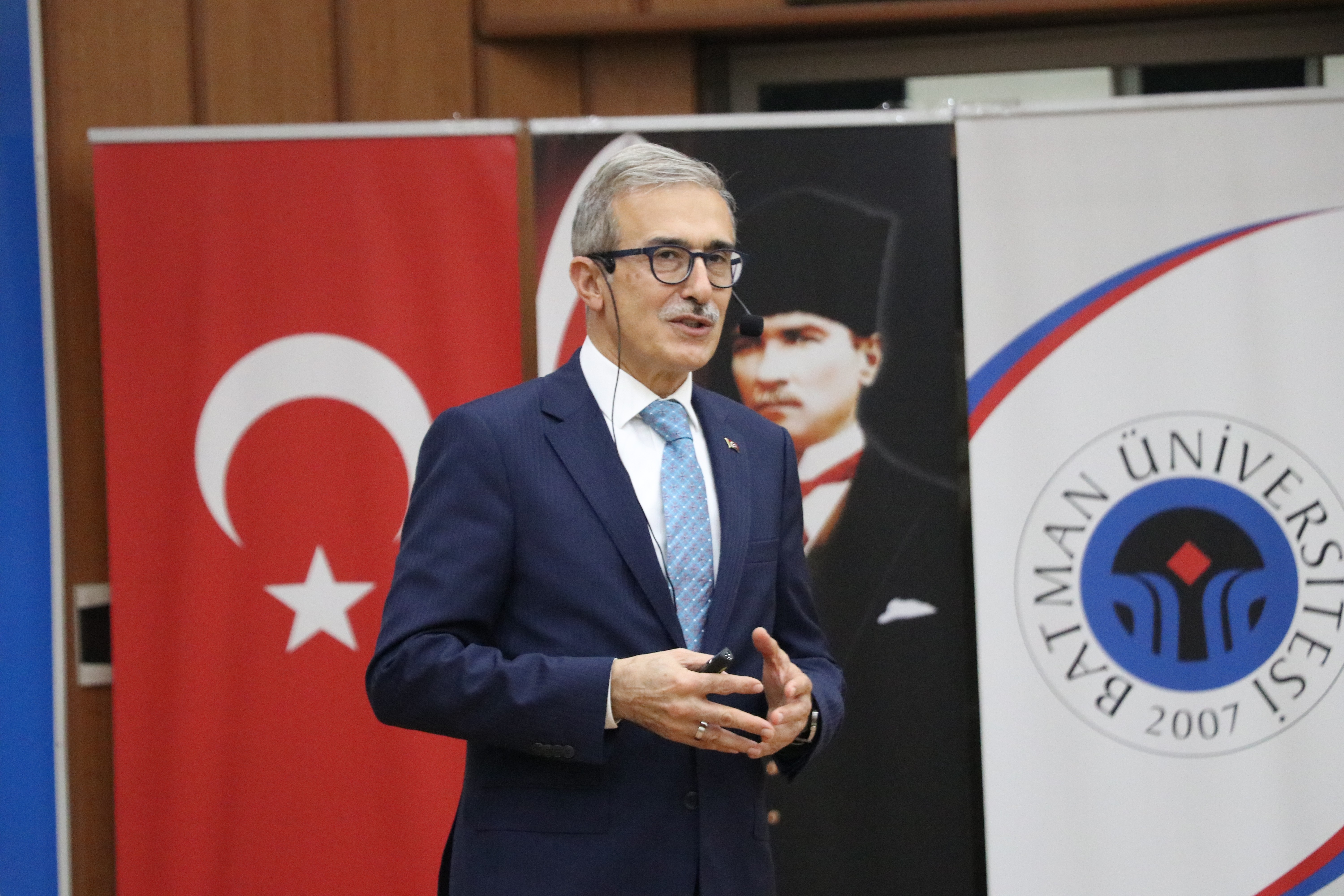 Batman Üniversitesinin davetlisi olarak kente gelen Savunma Sanayii Başkanı İsmail Demir, Merkez Kampüs Konferans Salonu'nda düzenlenen programda öğrencilerle buluştu.