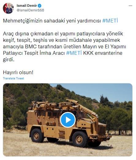 "Araç dışına çıkmadan el yapımı patlayıcılara yönelik keşif, tespit, teşhis ve kısmi müdahale yapabilmek amacıyla BMC tarafından üretilen Mayın ve El Yapımı Patlayıcı Tespit İmha Aracı METİ KKK envanterine girdi. Hayırlı olsun!"