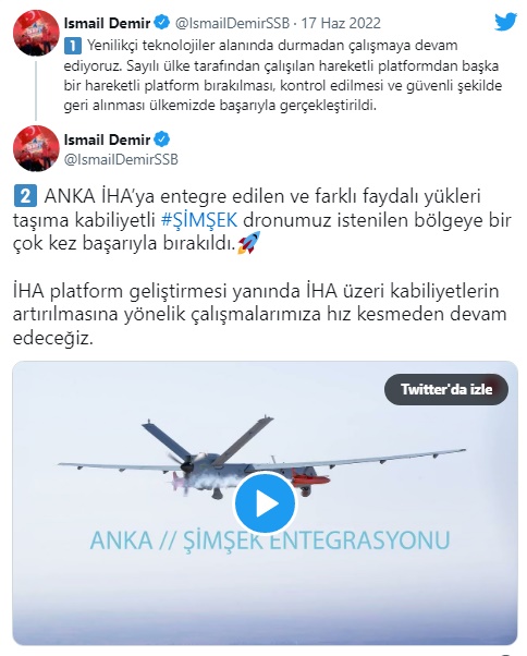 Savunma Sanayii Başkanı İsmail Demir, ANKA SİHA'ya ŞİMŞEK entegrasyonunun başarıyla yapıldığını açıkladı.