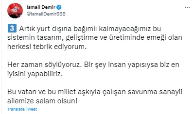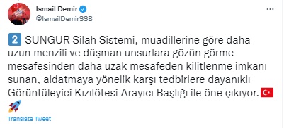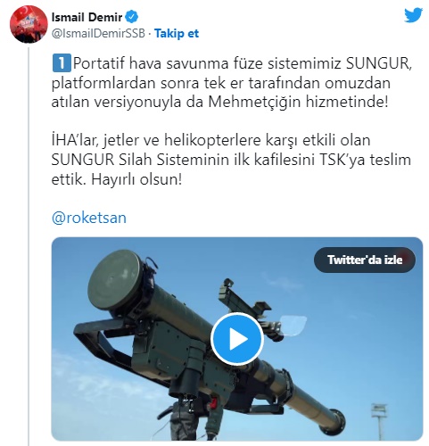 Demir, Twitter hesabından yaptığı paylaşımda, portatif hava savunma füze sistemi SUNGUR'un, platformlardan sonra tek er tarafından omuzdan atılan versiyonuyla da Mehmetçiğin hizmetinde olduğunu belirtti.