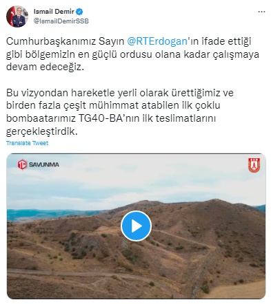 "Cumhurbaşkanımız Sayın Recep Tayyip Erdoğan'ın ifade ettiği gibi bölgemizin en güçlü ordusu olana kadar çalışmaya devam edeceğiz. Bu vizyondan hareketle yerli olarak ürettiğimiz ve birden fazla çeşit mühimmat atabilen ilk çoklu bombaatarımız TG40-BA'nın ilk teslimatlarını gerçekleştirdik."