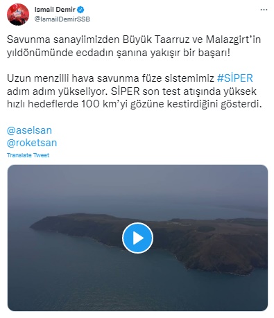"Savunma sanayiimizden Büyük Taarruz ve Malazgirt’in yıldönümünde ecdadın şanına yakışır bir başarı! Uzun menzilli hava savunma füze sistemimiz SİPER adım adım yükseliyor. SİPER son test atışında yüksek hızlı hedeflerde 100 km’yi gözüne kestirdiğini gösterdi. SİPER, bu vuruş başarısıyla bir aşamayı daha tamamladı. Emeği geçen herkesi tebrik ediyorum."
