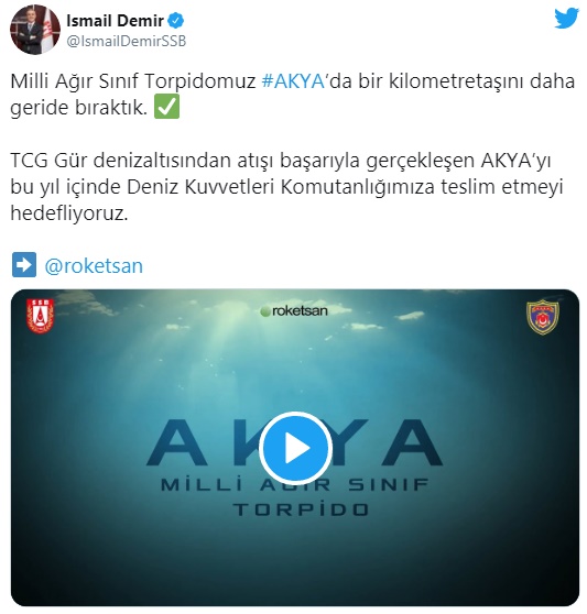 "Milli Ağır Sınıf Torpidomuz AKYA’da bir kilometretaşını daha geride bıraktık. TCG Gür denizaltısından atışı başarıyla gerçekleşen AKYA’yı bu yıl içinde Deniz Kuvvetleri Komutanlığımıza teslim etmeyi hedefliyoruz."