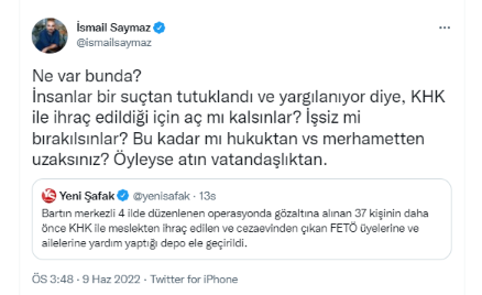 "Ne var bunda?" diye soran Saymaz, "İnsanlar bir suçtan tutuklandı ve yargılanıyor diye, KHK ile ihraç edildiği için aç mı kalsınlar? İşsiz mi bırakılsınlar? Bu kadar mı hukuktan vs merhametten uzaksınız? Öyleyse atın vatandaşlıktan." ifadelerini kullandı.