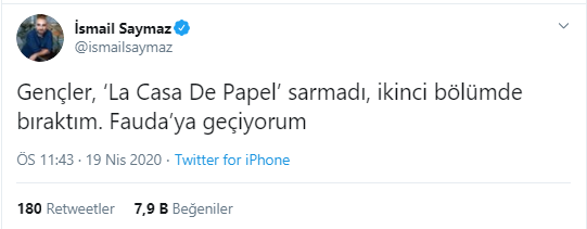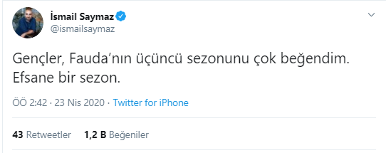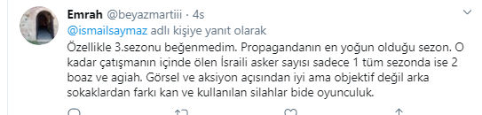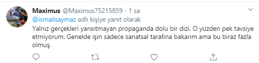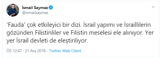 İsmail Saymaz, açıkça siyonistleri öven diziyi yaptığı paylaşımlarla yere göğe sığdıramadı. 'Efsane' diyerek tavsiye ettiği dizide, Filistinlilere yönelik alçak propagandaları görmezden geldi.
