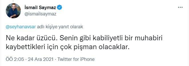 Cumhuriyet'e tepki gösteren Saymaz, muhabirin paylaşımına, "Ne kadar üzücü. Senin gibi kabiliyetli bir muhabiri kaybettikleri için çok pişman olacaklar." cevabını verdi.