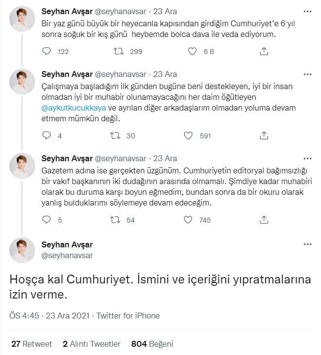 "Cumhuriyet'e heybemde bolca dava ile veda ediyorum" açıklamasında bulunan Cumhuriyet muhabiri Seyhan Avşar, zor durumda kalacağını ifade etti. Avşar, "Cumhuriyetin editoryal bağımsızlığı bir vakıf başkanının iki dudağının arasında olmamalı" ifadesini kullanarak laikçi kemalist yayın organından ayrıldığını paylaştı.
