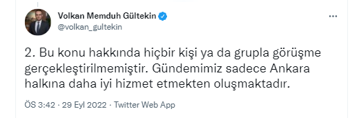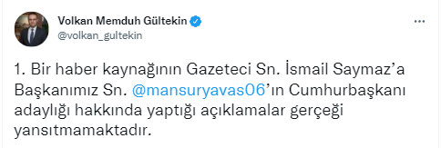 Twitter hesabından paylaşımda bulunan Gültekin, "Bir haber kaynağının Gazeteci Sn. İsmail Saymaz’a Başkanımız sayın Mansur Yavaş'ın Cumhurbaşkanı adaylığı hakkında yaptığı açıklamalar gerçeği yansıtmamaktadır. Bu konu hakkında hiçbir kişi ya da grupla görüşme gerçekleştirilmemiştir. Gündemimiz sadece Ankara halkına daha iyi hizmet etmekten oluşmaktadır." dedi.