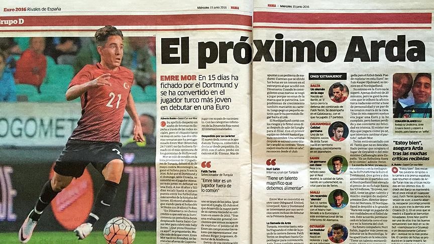 İspanyol spor gazetesi Marca, Türkiye'nin Avrupa Futbol Şampiyonası tarihinde forma giyen en genç futbolcusu Emre Mor'a geniş yer ayırdı.