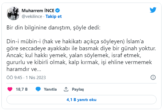 Muharrem İnce, Twitter hesabından yaptığı paylaşımda, bir din bilginine danıştığını ve seccadeye ayakkabı ile basmanın değil; kul hakkı yemenin ve yalan söylemenin günah olduğunu belirtti.