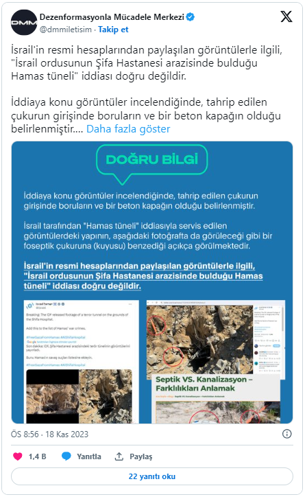Dezenformasyonla Mücadele Merkezi, İsrail'in resmi hesaplarından paylaşılan görüntülerle ilgili, 'İsrail ordusunun Şifa Hastanesi arazisinde bulduğu Hamas tüneli' iddiasının doğru olmadığını açıkladı.