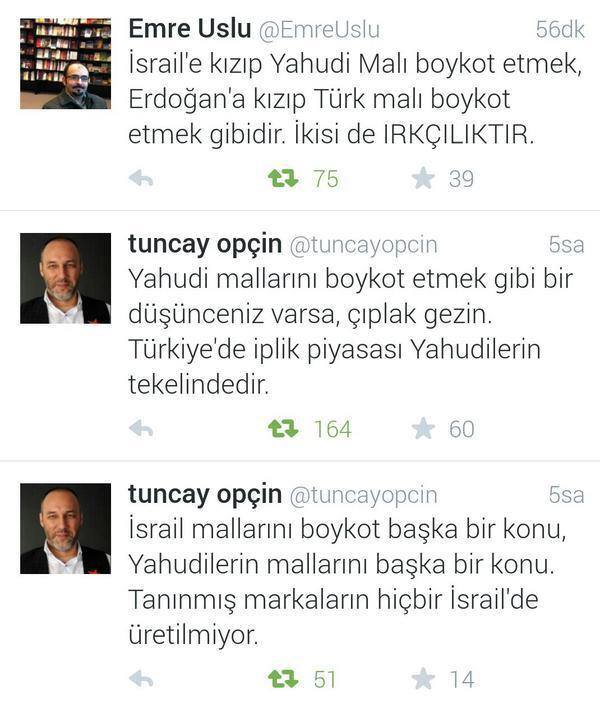 Daha önce haberlerinde İsrail'in Gazze'deki "terör unsurlarını" vurduğunu ifade ederek Filistin direnişini terörizmle ilişkilendiren Paralel Medya mensupları, sosyal medya hesapları üzerinden İsrail ürünlerine karşı başlatılan boykota ateş püskürdü. Gülen Örgütü'nün Today's Zaman gazetesinde yazarlık yapan Emre Uslu ve grubun tetikçi gazetecilerinden Tuncay Opçin, sosyal medya hesapları üzerinden boykota karşı çıktı. Gülen'in sözcüleri, boykot kararını sulandırmak için peşpeşe mesajlar atarak Cemaat sempatizanlarına adeta "sakın İsrail ürünlerini almamazlık etmeyin" çağrısında bulundu.