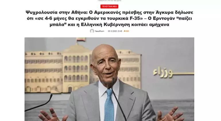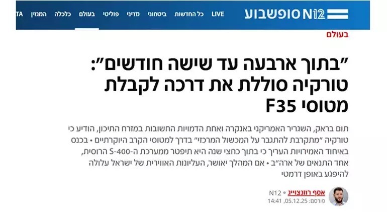 ABD'nin Ankara Büyükelçisi ve Suriye Özel Temsilcisi Barrack’ın F-35 savaş uçağı meselesinin birkaç ay içinde çözüleceğini ima etmesiyle Ankara'nın F-35'e sahip olma ihtimali Atina'da ve Tel Aviv'de alarm zillerini çaldırdı. Haberi Tel Aviv merkezli Maariv “Türkiye, Altın Anlaşma’ya doğru gidiyor” başlığı ile verdi.