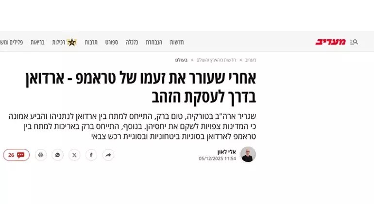 Tel Aviv merkezli Maariv ise “Türkiye, Altın Anlaşma’ya doğru gidiyor” başlıklı haberinde “Washington ile Ankara’nın ilişkilerinin merkezinde F-35 mevzusu yer alıyor. ABD Başkanı Trump ile Cumhurbaşkanı Erdoğan’ın dostluğu çok güçlü, Barrack’ın da söylemleri düşünüldüğünde yeni bir anlaşma çok yakında duyurulabilir” ifadelerini kullandı.
