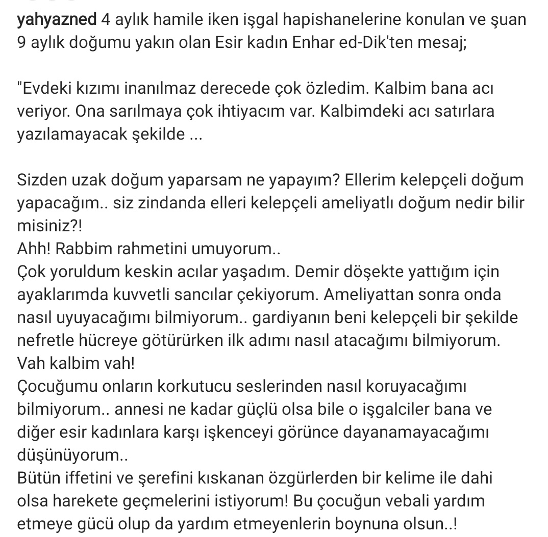 4 aylık hamile iken esir edilen ve İsrail zindanlarına konulan Anhar Alddik, haftalardır zor şartlar altında yaşam mücadelesi verirken bu kez de doğumunu elleri yatağa kelepçeli bir şekilde yapacak. Anhar’ın bu dramı ailesine yazdığı mektupta ise daha da belirgin bir şekilde ortaya çıkıyor…