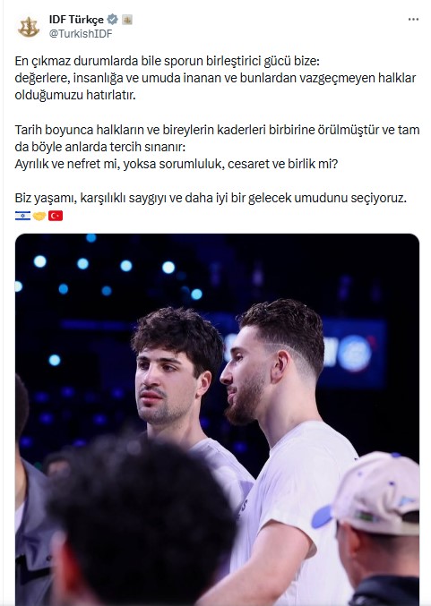 İsrail Savunma Kuvvetleri'nin (IDF) resmi Türkçe hesabı, 2026 NBA All-Star etkinliğinde Türk basketbolcu Alperen Şengün ile İsrail Ordusu’nda görev yapmış siyonist basketbolcu Deni Avdija'nın yan yana fotoğrafını paylaşarak provokatif bir mesaj yayınladı.