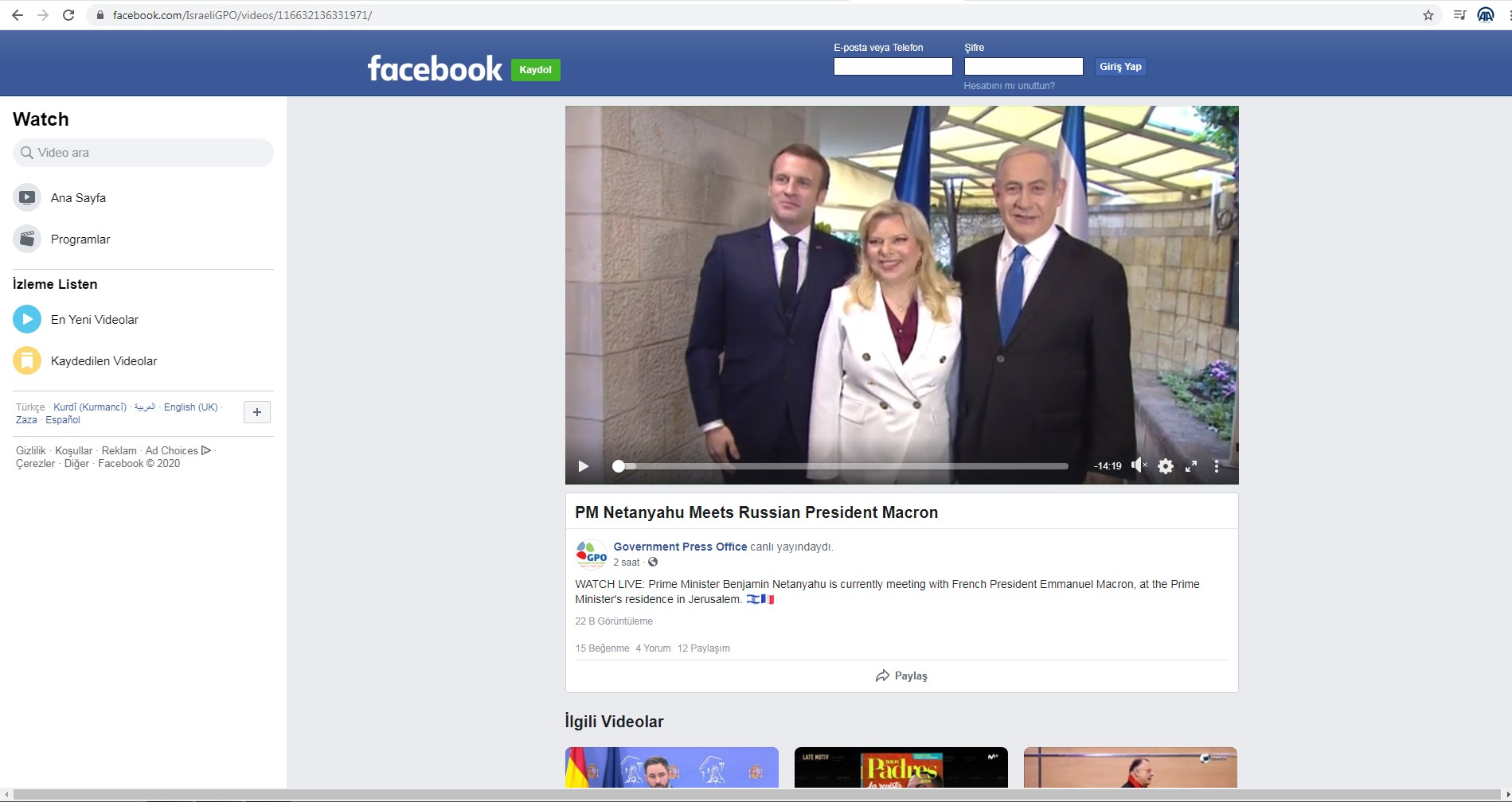 Basın ofisinin Facebook sayfasında Netanyahu ve eşi Sara'nın, Başbakanlık Ofisinde Macron'u karşılaması canlı olarak yayınlandı.