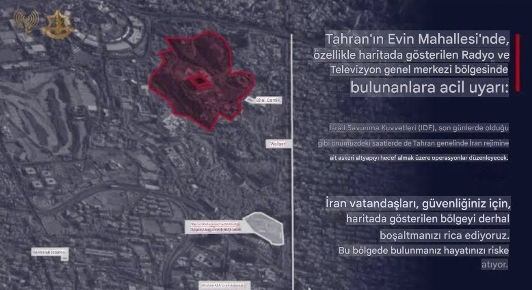 "Evin semtindeki İran Radyo ve Televizyon Kurumu yerleşkesi çevresinin boşaltılması gerekiyor. Kısa bir süre sonra İsrail ordusu bu bölgeye saldırı düzenleyecek."