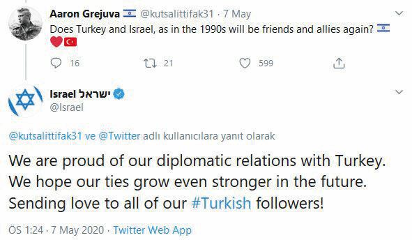 7 Mayıs'ta İsrail hükümeti resmi Twitter hesabından, "Türkiye ile diplomatik ilişkilerimizle gurur duyuyoruz. Bağlarımızın gelecekte daha da güçlenmesini umuyoruz. Bütün Türk takipçilerimize sevgilerimizi gönderiyoruz" mesajı yayınlamıştı. 12 Mayıs'ta ise Mısır, Yunanistan, Güney Kıbrıs, Fransa ve BAE'nin imzaladığı Türkiye karşıtı bildiriyi İsrail imzalamamıştı. İki ülke arasındaki iyi niyet beyanlarının nereye evrileceği merak konusu.