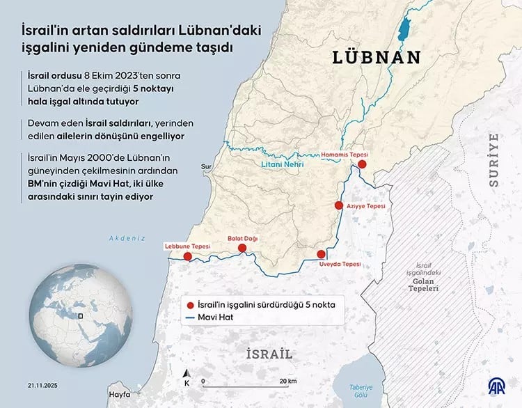 İsrail ordusunun 27 Kasım 2024'teki ateşkes anlaşmasını ihlal ederek Lübnan'ın güneyine düzenlediği hava saldırılarını artırması, bölgedeki gerilimi tırmandırdı. Saldırılar, gözleri yeniden İsrail'in Lübnan'ın güneyinde Hamamis, Aziyye, Uveyda, Balat ve Lebbune olmak üzere 5 noktada devam eden işgaline çevirdi.