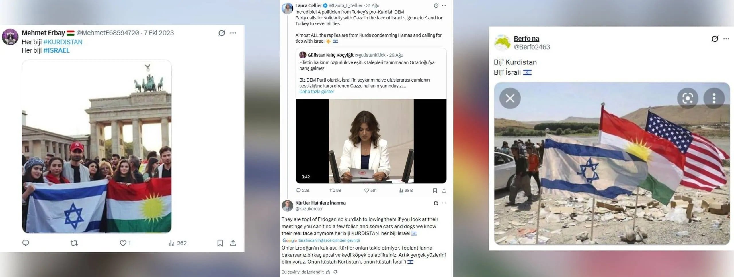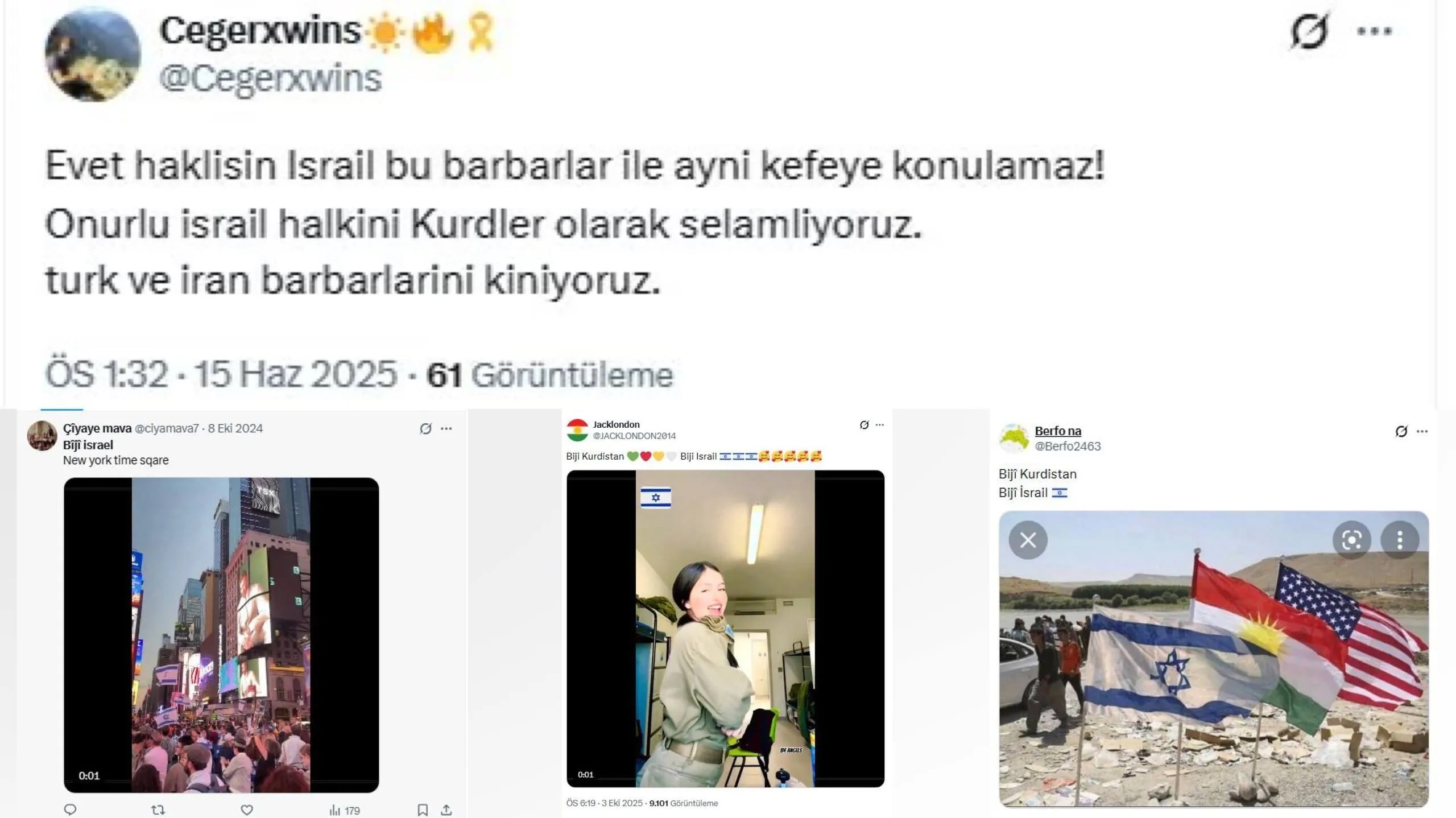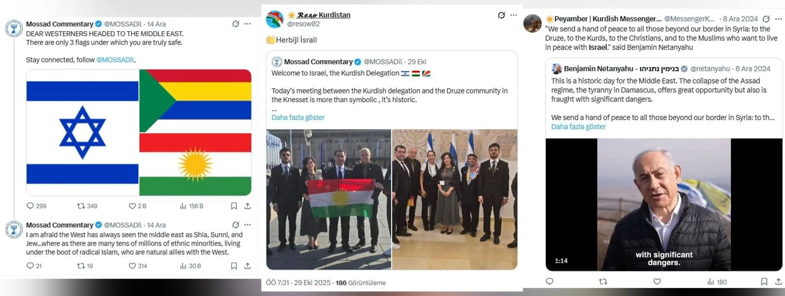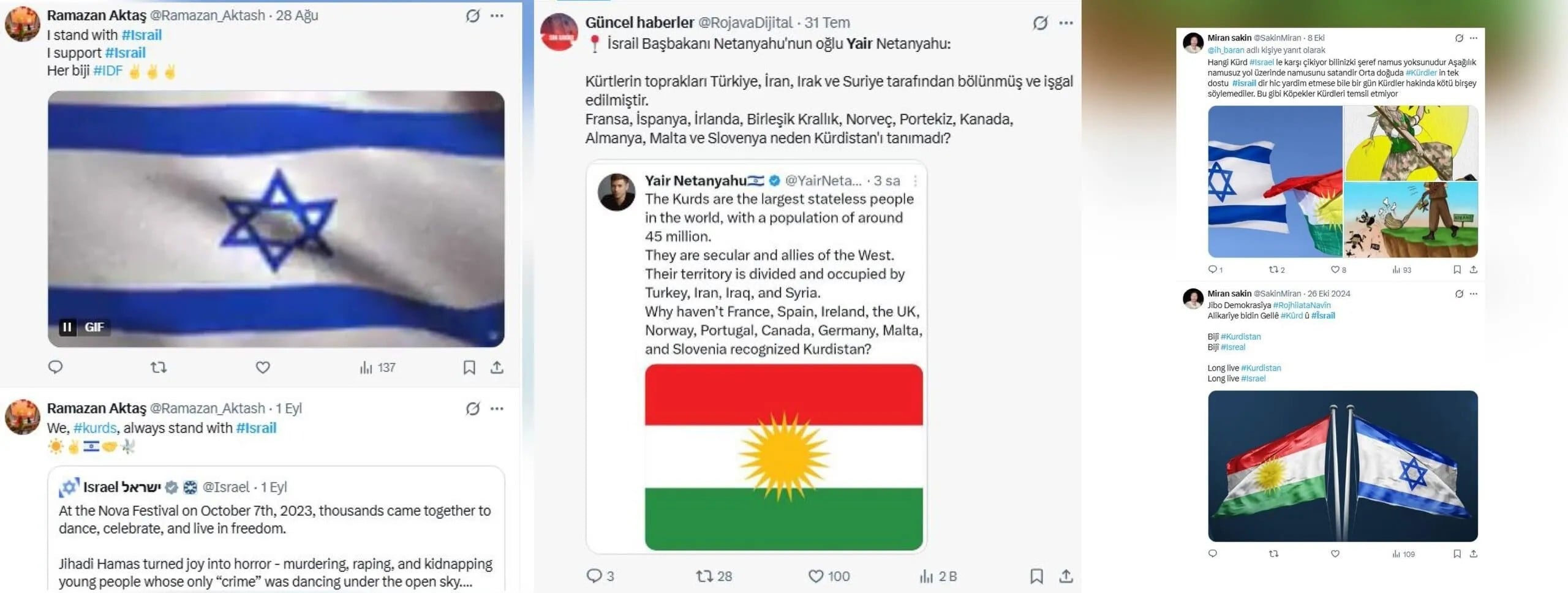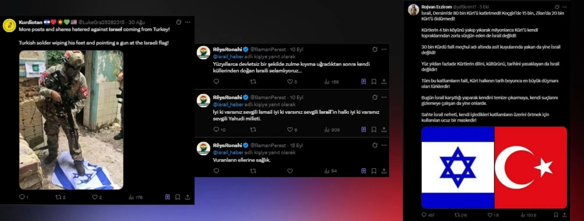 Bu hesaplar, "İsrail bu barbar Türk devletiyle aynı kefeye konulamaz, onurlu İsrail halkını Kürtler olarak selamlıyoruz." gibi, bölge gerçekliğiyle uyuşmayan ve yapay duran metinlerle Kürt toplumunu manipüle etmeye çalışıyor. Ayrıca, işgalci İsrail'in Dürzilere verdiği desteğin abartılarak, Kürtler için İsrail ile bağ kurmanın "hayat damarı" olduğu algısı oluşturulmaya çalışılıyor.
