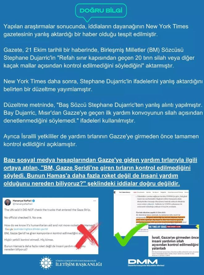 Dezenformasyonla Mücadele Merkezi, Gazze'ye giden yardım tırlarıyla ilgili ortaya atılan, "Hamas'a daha fazla roket değil de insani yardım olduğunu nereden biliyoruz?" iddialarının doğru olmadığını bildirdi.