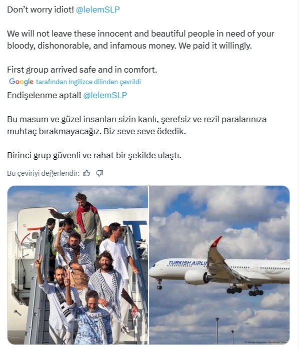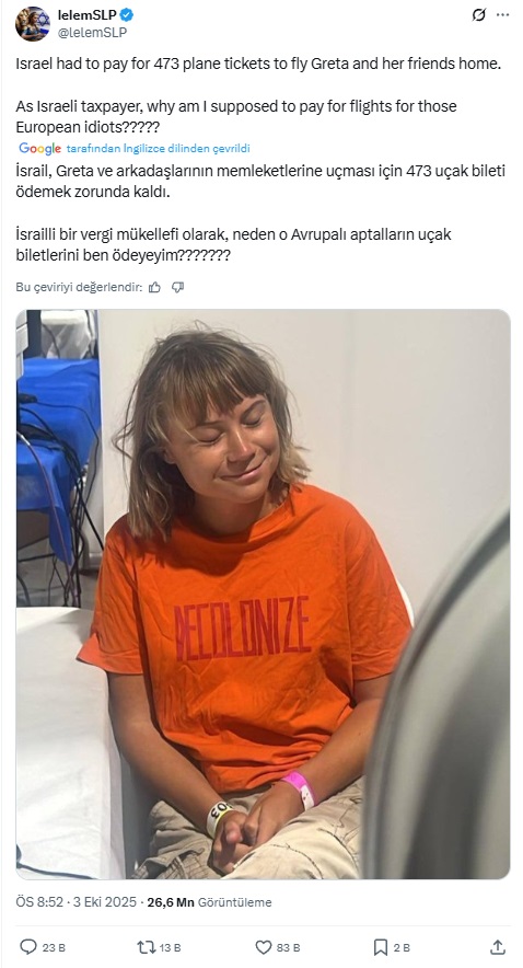 İsrailli troller, Sumud Filosu aktivistlerinin ülkelerine dönüşleriyle ilgili paylaşımlar yaparak, “Niye Greta ve arkadaşlarının uçak biletlerini biz ödüyoruz?” ifadelerini kullandı.