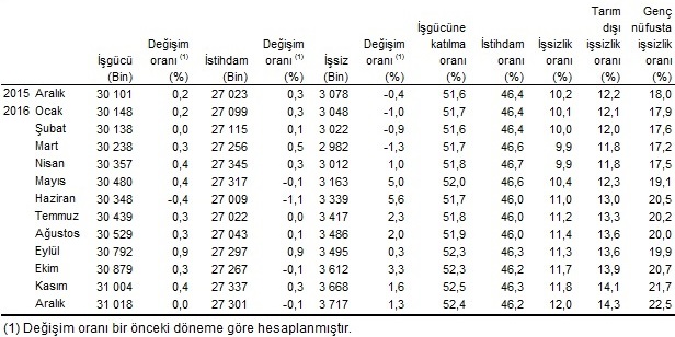 İşgücü 2016 yılı Aralık döneminde bir önceki yılın aynı dönemine göre 888 bin kişi artarak 30 milyon 540 bin kişi, işgücüne katılma oranı ise 0,7 puan artarak yüzde 51,6 olarak gerçekleşti. Aynı dönemler için yapılan kıyaslamalara göre; erkeklerde işgücüne katılma oranı 0,5 puanlık artışla yüzde 71,5, kadınlarda ise 1 puanlık artışla yüzde 32,2 olarak gerçekleşti.