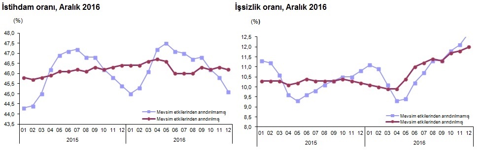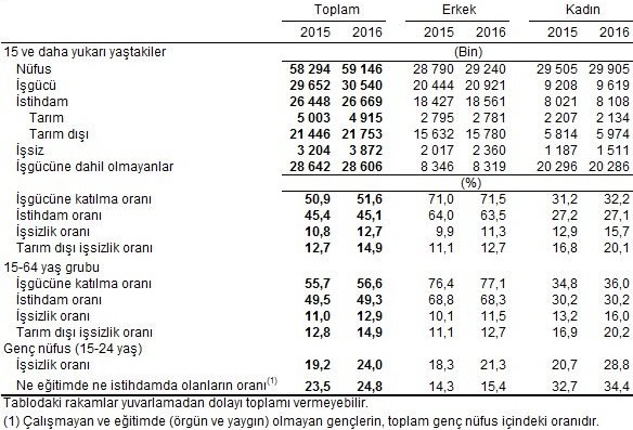 Buna göre, Türkiye genelinde 15 ve daha yukarı yaştakilerde işsiz sayısı 2016 yılı Aralık döneminde geçen yılın aynı dönemine göre 668 bin kişi artarak 3 milyon 872 bin kişi oldu. İşsizlik oranı ise 1,9 puanlık artış ile yüzde 12,7 seviyesinde gerçekleşti. Aynı dönemde; tarım dışı işsizlik oranı 2,2 puanlık artış ile yüzde 14,9 olarak tahmin edildi. Genç nüfusta (15-24 yaş) işsizlik oranı 4,8 puanlık artış ile yüzde 24 olurken,15-64 yaş grubunda bu oran 1,9 puanlık artış ile yüzde 12,9 olarak gerçekleşti.